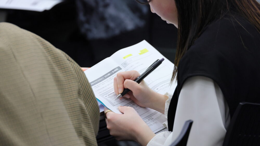 プログラムの説明資料やアンケート結果をじっくり読み込んだ後、それぞれの評価シートに評価ポイントと点数を記入。BGMが流れる落ち着いた空間で、学生たちは集中して資料に目を通し、一人ひとりが自分の考えに基づいて丁寧に評価を進めていきました。