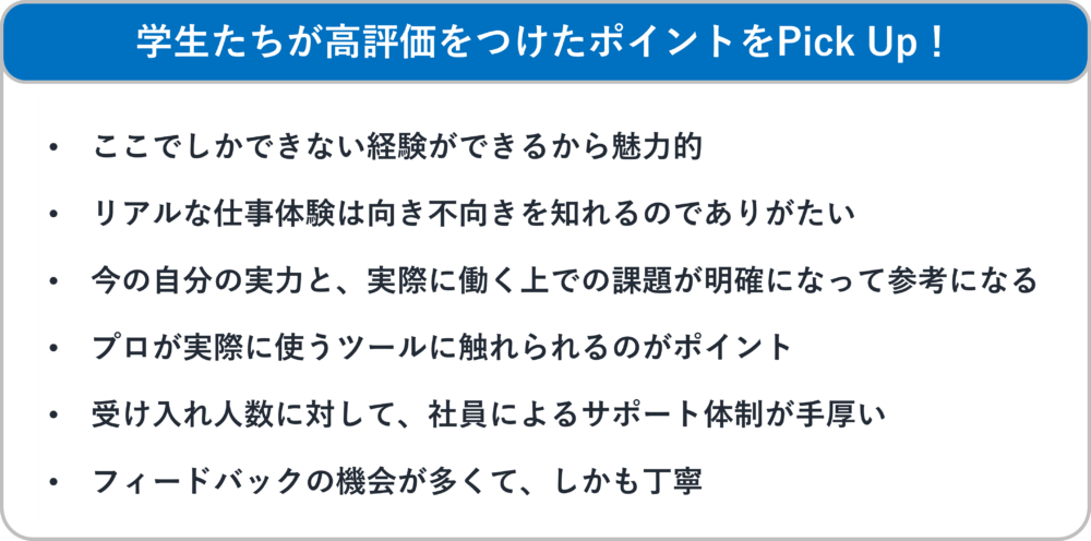 いっぽう、その会社でなくても体験できるようなありきたりなプログラムや、実務を体験できないプログラム、学生数に比べて社員のサポート体制が十分ではないプログラム、フィードバックが少ないプログラムなどについては厳しい目が向けられました。また、「期間が長すぎる」「3年生しか参加できない」といった点も、学生にとってはマイナス評価の要因になるようです。